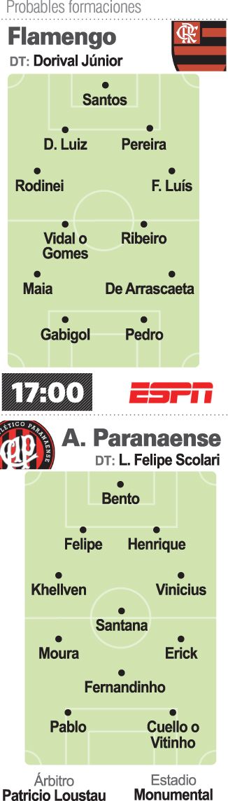 La victoria de Flamengo paga 1.5, mientras que la de Paranaense otorga 7. Esto quiere decir que si alguien decide apostar 1.000 pesos a los de Río de Janeiro, percibirá 1.500; en cambio, si opta por el conjunto dirigido por Luiz Felipe Scolari,
