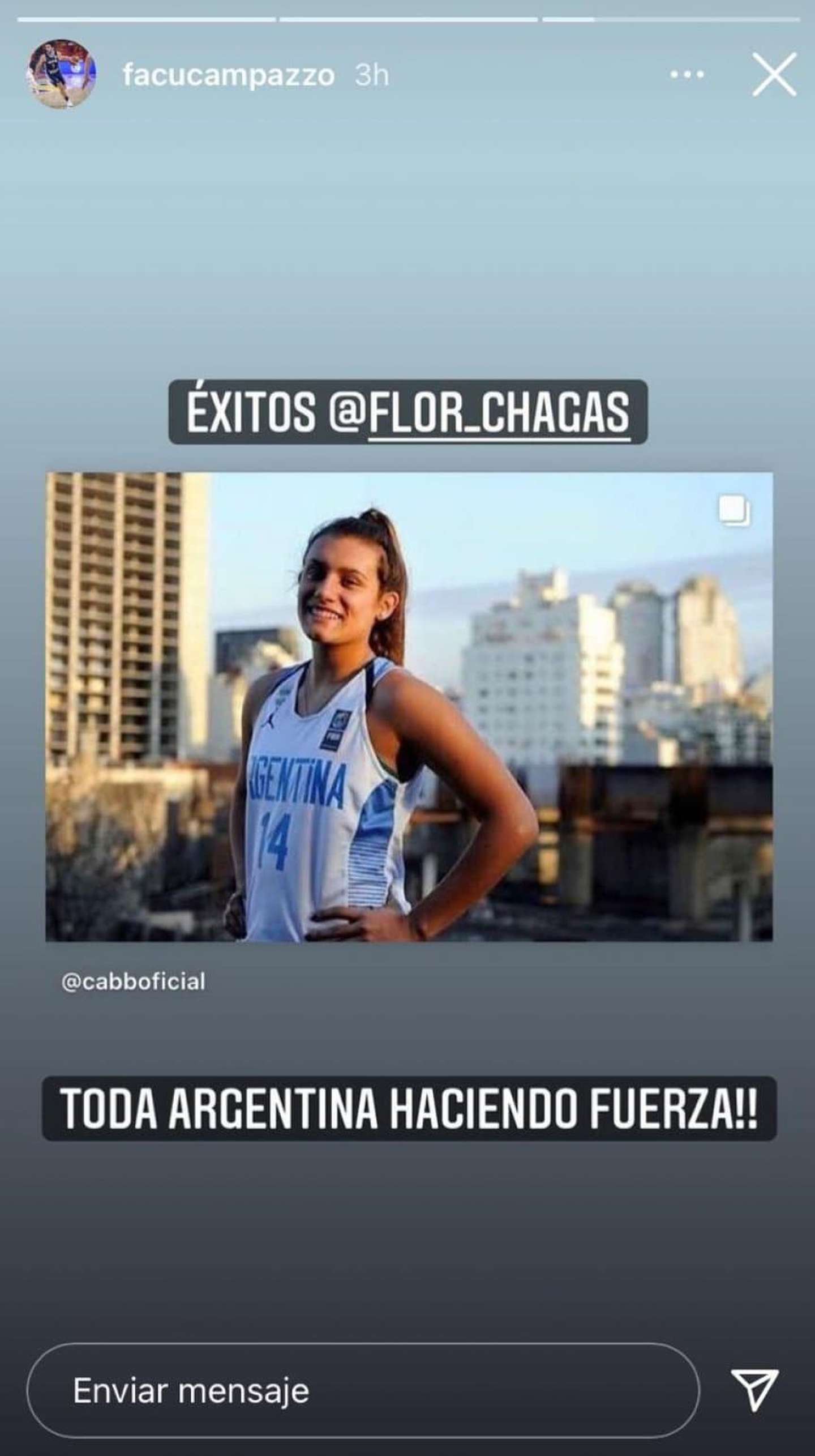Al enterarse que Florencia Chagas iba a participar del draft, Facundo Campazzo, quien se encuentra jugando en Denver Nuggets de la NBA, publicó una historia en su cuenta de Instagram en la que le deseó “éxitos” a Florencia Chagas y aseguró que “toda la Argentina está haciendo fuerza” por ella.
