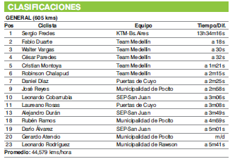 La última jornada de la prueba no tuvo mayores complicaciones para el malla líder de la carrera. Sergio Fredes (KTM) que se calzó la casaca de dueño de la general el primer día, luego de llegar escapado con el salteño Daniel Díaz (Puertas de Cuyo) con una diferencia de 16 segundos con respecto al pelotón.