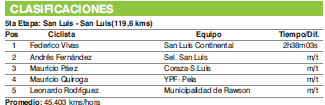 La última etapa, desarrollada íntegramente en un circuito citadino de la capital puntana, terminó en embalaje masivo y allí primó la velocidad de Federico Vivas. El ciclista bonaerense que corre en el equipo San Luis Continental completó el esfuerzo de 119,6 kilómetros en un tiempo de 2h38m03s, derrotando en el esfuerzo supremo del embalaje al joven puntano Andrés Fernández (Selección de San Luis), al triple campeón mendocino de ruta, Mauricio Páez (Coraza-San Luis) y al también sanluiseño Mauricio Quiroga (YPF-Pela). Unos metros detrás, en el quinto lugar, llegó el sanjuanino Leonardo Rodríguez (Municipalidad de Rawson).
