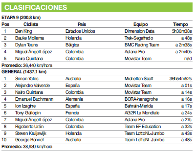 El corredor estadounidense Ben King (Dimension Data) consiguió ayer la victoria en la novena etapa de la Vuelta a España, segunda para él en esta ronda de 2018, tras haber completado un recorrido de 200,8 kilómetros con salida en Talavera de la Reina (Toledo) y llegada en la cumbre de La Covatilla (La Hoya, Salamanca), en cuya cima se vistió con la malla roja de líder de la general el australiano Simon Yates (Michelton-Scott) quien perdiera la general del pasado Giro de Italia en la penúltima etapa.