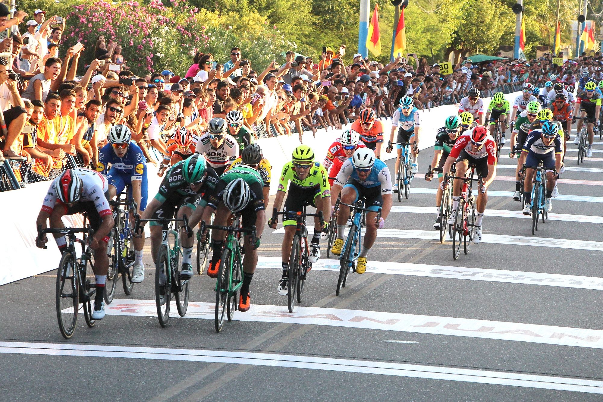 Al pasar por La Rinconada el pelotón neutralizó a Lucero y Osorio y dejo hacer a Navarrete y Machado hasta girar en la rotonda de calle 11 y Avenida Uñac. Allí a 6 kilómetros de la meta Al pasar por La Rinconada el pelotón neutralizó a Lucero y Osorio y dejo hacer a Navarrete y Machado hasta girar en la rotonda de calle 11 y Avenida Uñac. Allí a 6 kilómetros de la meta se armaron los trenes de los equipos. Sagan le levantó a Bennet y Gaviria atacó por la derecha metiendo un estiletazo que laceró las intenciones de sus rivales.