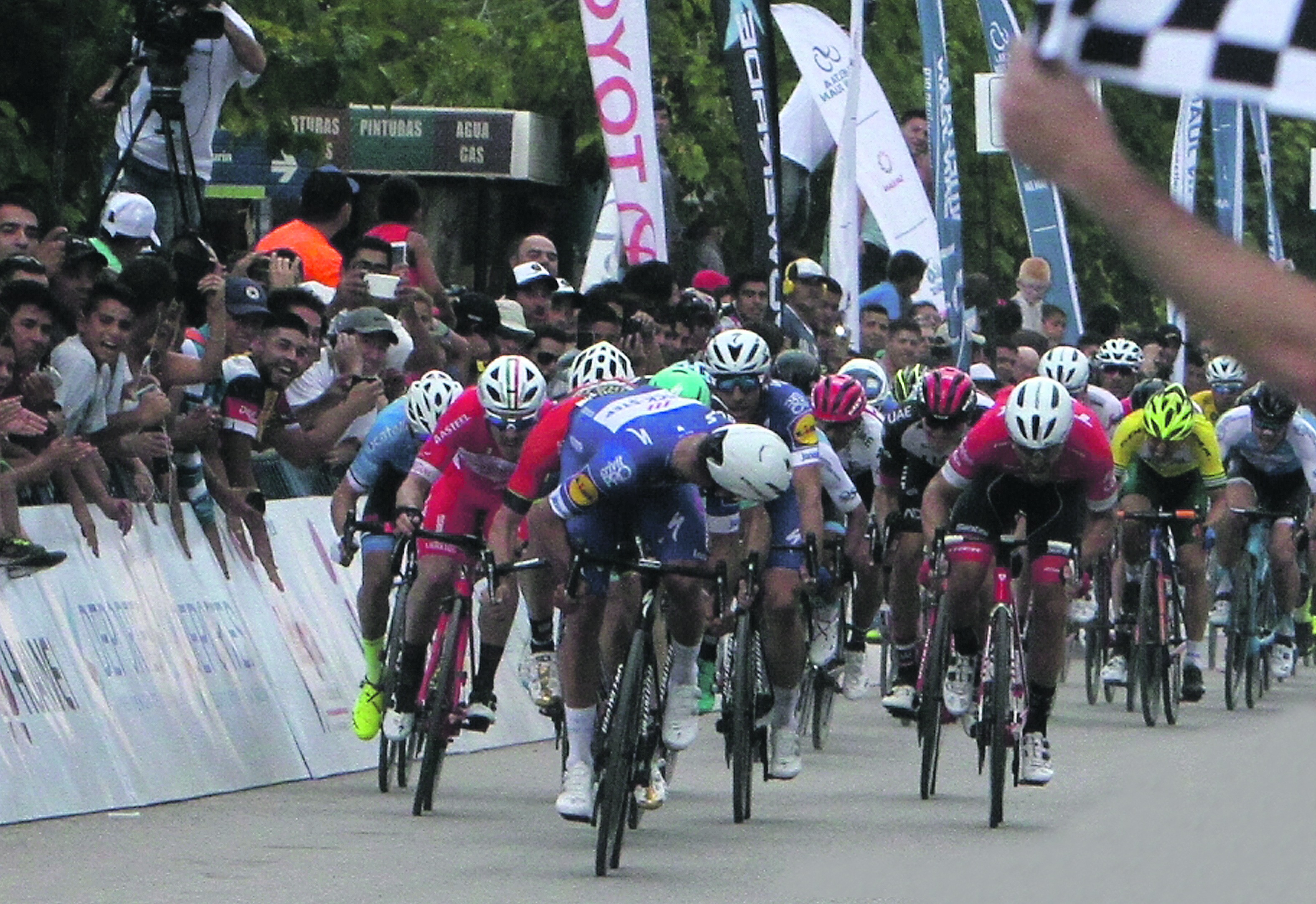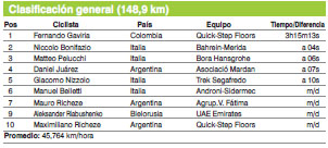 Y, mientras ellos buscaban la primera meta intermedia, que ganó el menor de los hermanos Richeze (también ganó la segunda) y la de montaña, en la que se impuso el charrúa Anchieri; el pelotón durmió una larga siesta. Así el hueco que se abrió entre los siete punteros y el grupo mayoritario llegó a los 2m40s cuando se atravesó Santa Rosa, villa cabecera del departamento 25 de Mayo. Diferencia que se achicó a 1m54s, cuando se giró hacia el Oeste por la ruta 295, luego se volvió a estirar a 2m28, al pasar por Carpintería. Desde ese momento, se pusieron en la cabeza del pelotón los WTT, los hombres del Trek, el Lotto Soudal, el Quick-Steep y el Movistar se fueron alternando y lograron neutralizarlos antes de entrar a la última vuelta al circuito pocitano. Desde allí, al final, no se escapó nadie, aunque lo intentaron Gerardo Tivani (M. Pocito) y el estadounidense Daniel Eaton (UnitedHealthcare). Así se llegó a la crónica de un final anunciado, con Gaviria dando cátedra.