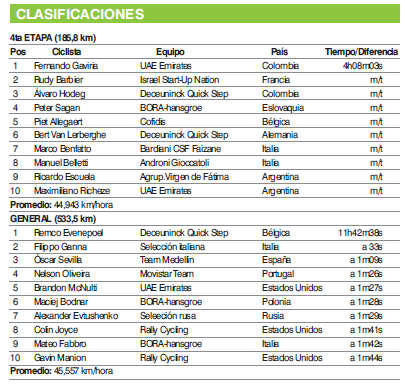 La etapa que unió las capitales de los departamentos Jáchal y Valle Fértil la ganó como preveía la cátedra, Fernando Gaviria. El colombiano del UAE Emirates definió con toda su categoría el embalaje masivo con el que concluyó el parcial de 185,8 kilómetros en 4h08m03s. El francés Rudy Barbier (Israel Start) y el, también, colombiano Álvaro Hodeg (Deceuninck Quick Step), lo escoltaron.