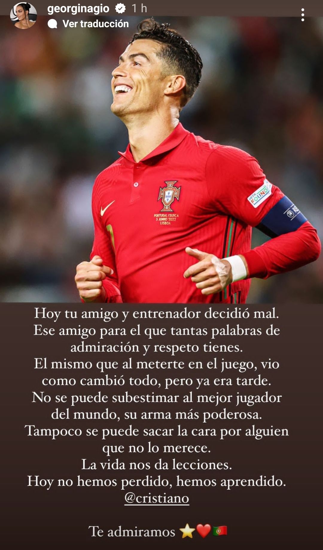 La modelo argentina Georgina Rodríguez, esposa de Cristiano Ronaldo, fulminó hoy a Fernando Santos, entrenador portugués, por ponerlo como suplente al astro en lo que fue la eliminación con Marruecos, por los cuartos de final de Qatar.
