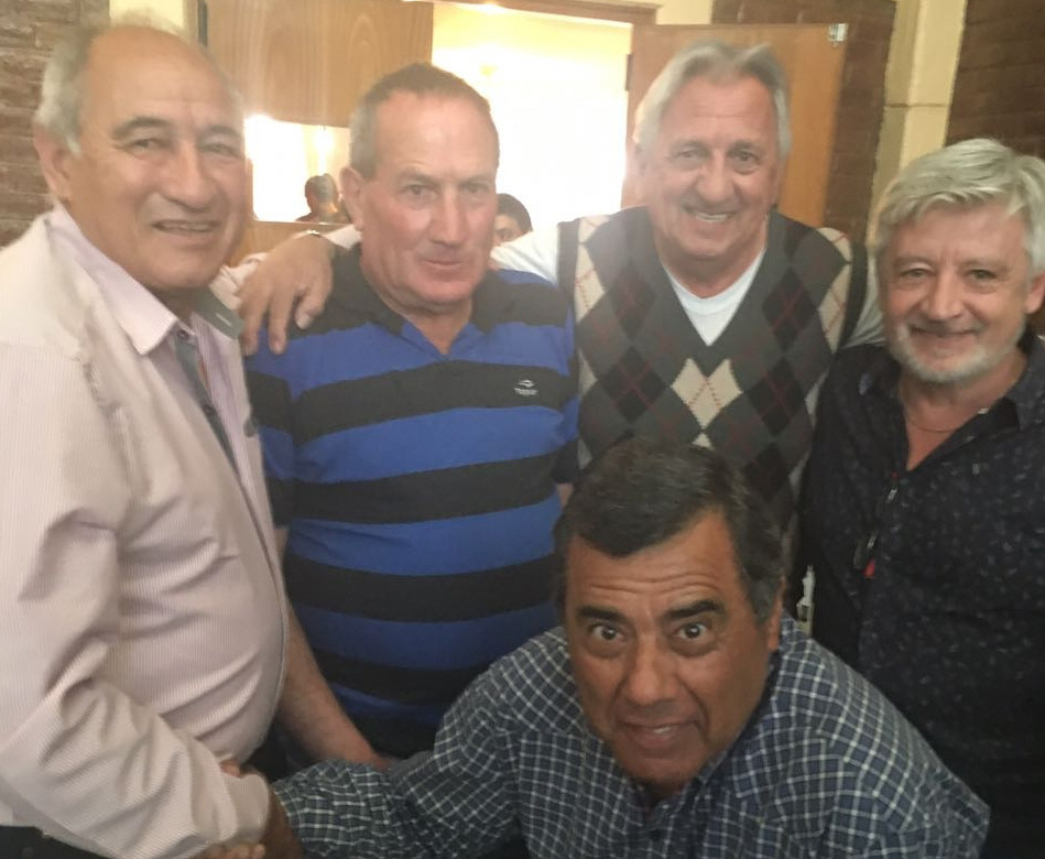 Oscar Escoda, Oscar Fornari, Juan Carlos Soto y Roberto Mallea estuvieron ayer en un almuerzo de ex jugadores de fútbol realizado en el club Maipú, de Mendoza, y comparten un momento con Basilio Spitalieri, quien jugara en Independiente Rivadavia.