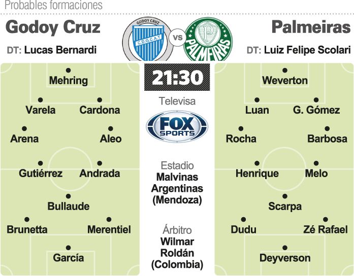 Godoy Cruz recibirá hoy a Palmeiras, de Brasil, por la ida de los octavos de final de la Copa Libertadores de América en una instancia histórica para el "Tomba", que intentará pasar por primera vez a cuartos de final.