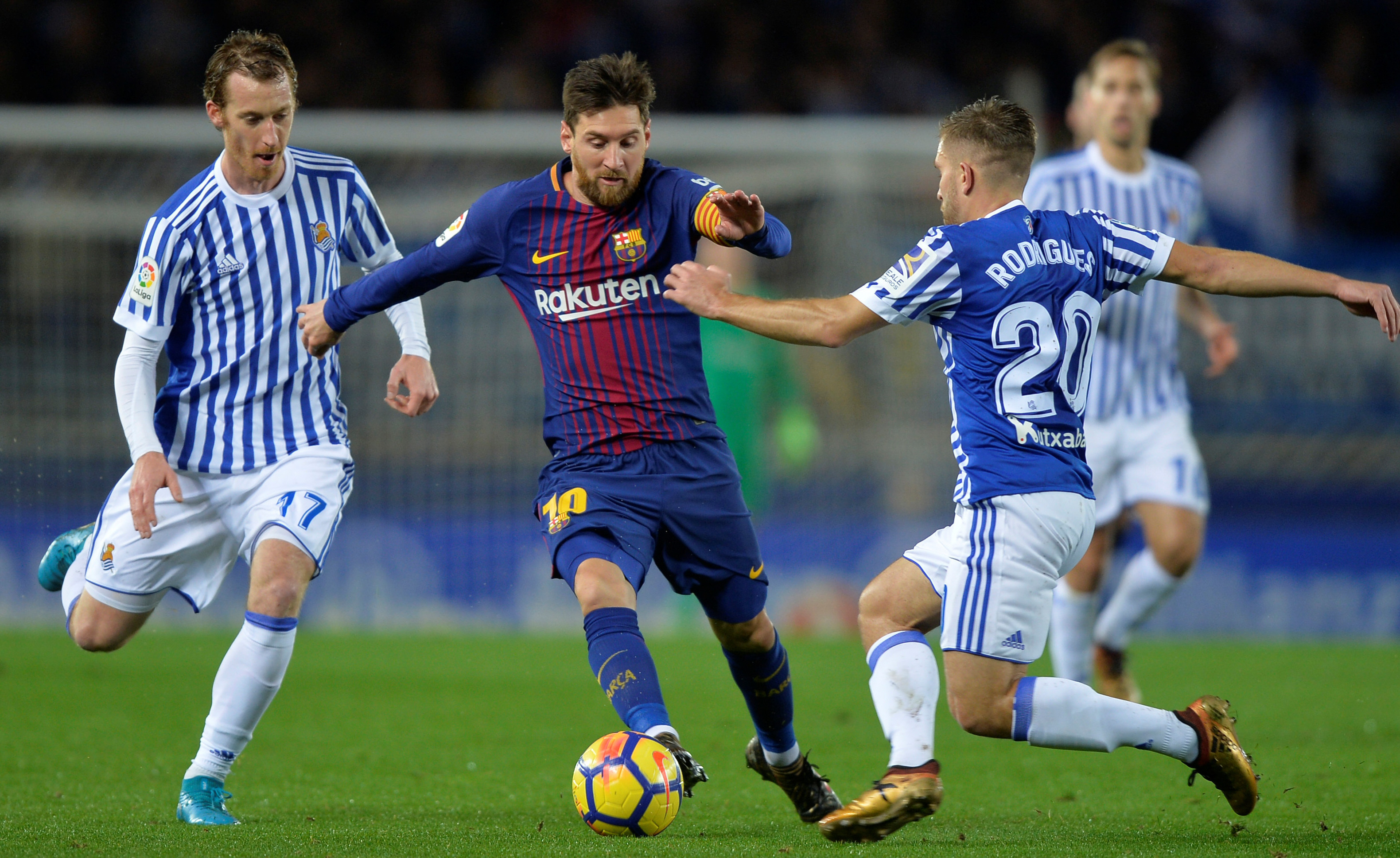 Lionel Messi selló ayer la victoria del líder e invicto Barcelona sobre Real Sociedad, por 4 a 2, de visitante, en un encuentro de la 19na fecha de la liga de España de fútbol.