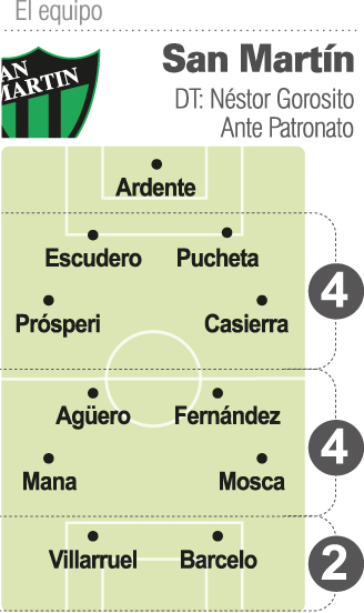 Con un sistema 4-4-2 y un equipo que presenta una constante vocación ofensiva, pero manteniendo un esquema defensivo que fue lo que mejor le rindió a Pipo en el semestre pasado, San Martín formará mañana con Luis Ardente; Prósperi, Matías Escudero, Arian Pucheta, Mauricio Casierra; Nicolás Mana, Emiliano Agüero, Fernández, Mosca; Gustavo Villarruel y Facundo Barcelo.