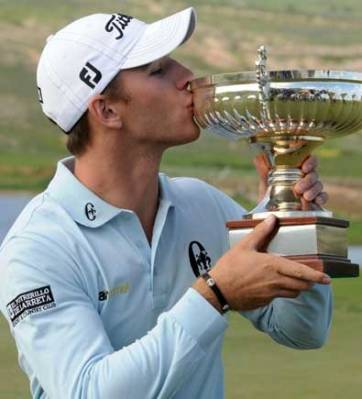 presentaciones en el máximo circuito europeo, el cordobés Estanislao Goya levantó hoy la copa como ganador del abierto de golf Madeira, Portugal, la primera que obtiene en el tour.