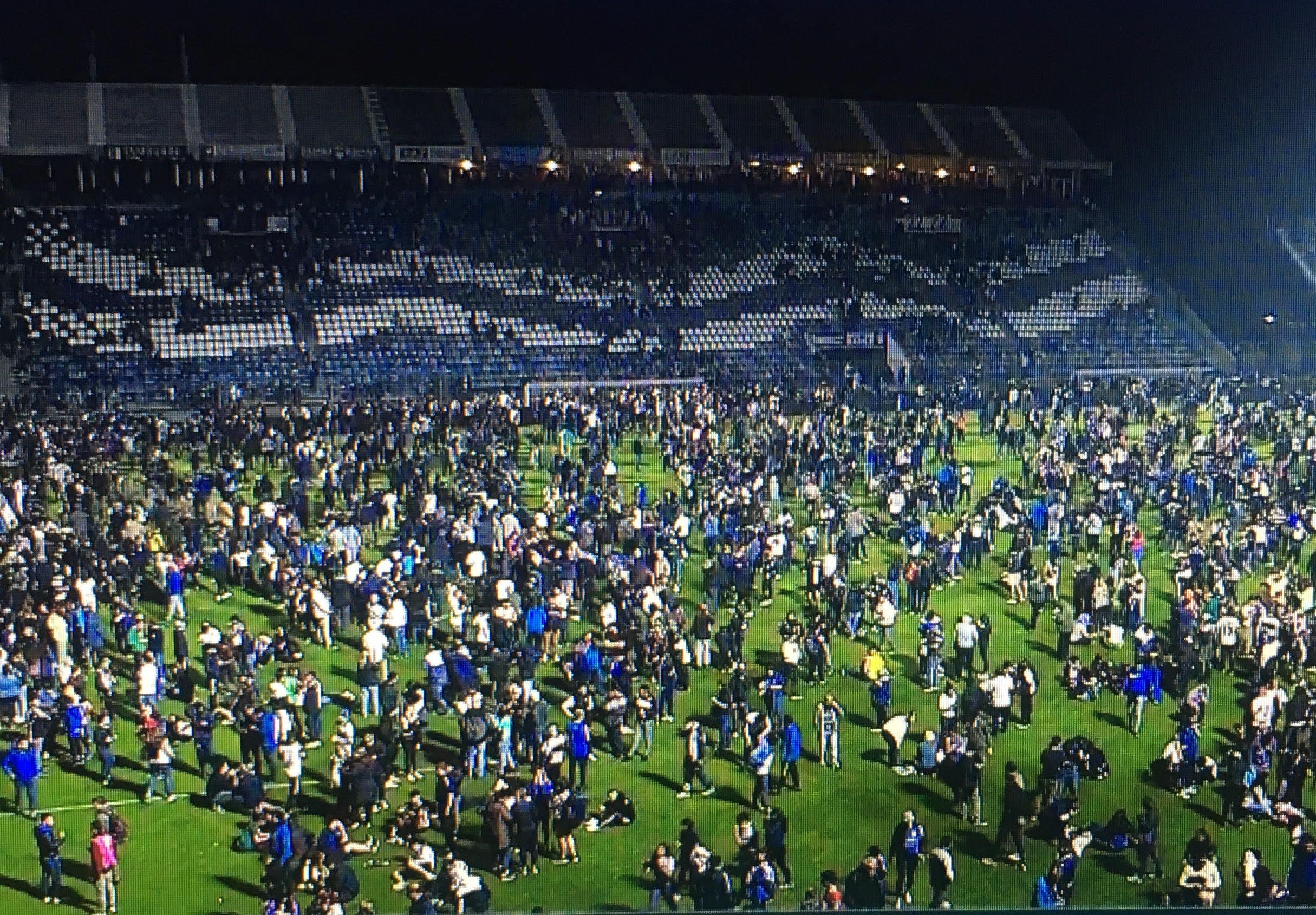 Primero fueron los hinchas y luego los suplentes quienes comenzaron a cubrirse los rostros. El árbitro Mastrángelo determinó que los jugadores y sus cuerpos técnicos se fueran a los vestuarios. Los hinchas, al estar las puertas de salida cerradas, encontraron en el campo de juego la única vía de escape posible y cientos de ellos saltaron al césped.