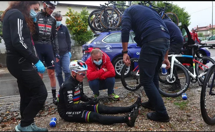 El máximo favorito para ganar la presente edición del Giro de Italia, el belga Remco Evenepoel (Soudal-Quick Step) sufrió dos rodadas en la etapa de ayer.