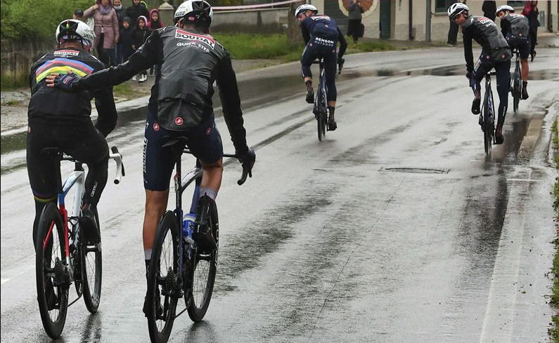 Una jornada lluviosa, fría, provocó que la 5ta etapa del Giro de Italia, corrida entre Atripalda y Salerno; fuese lo más parecido al Infierno del Dante. Antes de los 5 kilómetros de competencia, un perro se lanzó sobre los tobillos de Davide Ballarini (Soudal-Quick Step), quien al correrse su bicicleta arrastró a su jefe de filas, el belga Remco Evenepoel. Posteriormente, cuando el pelotón transitaba con mucho cuidado esquivando las "trampas" que le imponía el camino, en lugares donde el agua de la lluvia persistente formaba pequeña lagunas, hubo otra gran rodada, la del pelotón, y al piso se fueron 20 pedalistas, el esloveno Primoz Roglic (Jumbo-Visma) y el colombiano Fernando Gaviria (Movistar), el australiano Jay Vine, y el alemán Pascal Ackermann (UAE Emirates), Fernando Gaviria (Movistar) e incluso a la Maglia Rosa, Andreas Leknessund (Team DSM), entre otros.