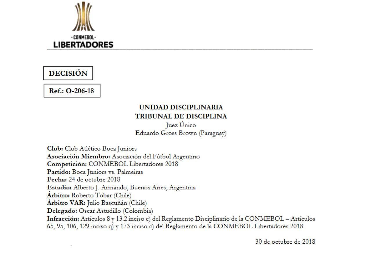 Según detalló la Confederación Sudamericana de Fútbol, la sanción al entrenador corresponde a una "reincidencia en ingreso tardío del equipo para el segundo tiempo”, durante el partido del miércoles, en La Bombonera, en el que su equipo ganó por 2 a 0 frente a los brasileños por una de las semifinales de la Copa Libertadores 2018.