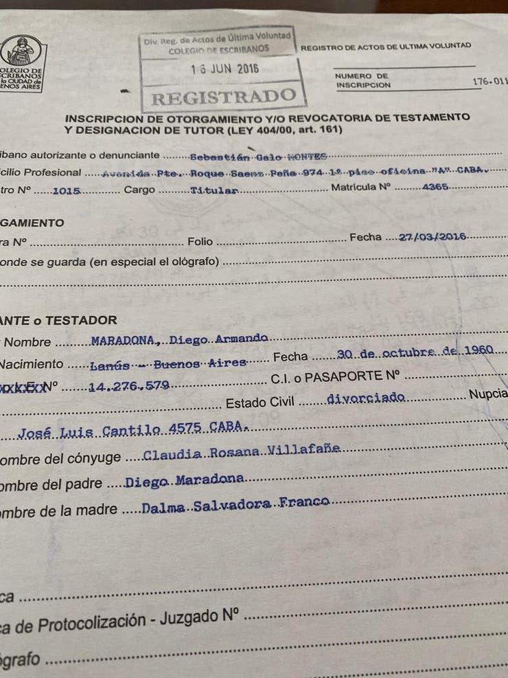 Maradona dijo entonces que pedía la anulación del testamento que, según sus propios dichos, habría firmado contra su voluntad. Diego trabajaba como técnico en Dubai cuando decidió la revocación y LA NACION tuvo acceso a esos documentos, redactados en árabe, que fueron remitidos a la embajada argentina en los Emiratos Árabes Unidos para, finalmente, recalar en el Ministerio de Relaciones Exteriores, Comercio Internacional y Culto en nuestro país, con la traducción correspondiente, encabezado bajo el título "Traducción Pública: Notificación por anulación de testamento para ser utilizado en la República Argentina".