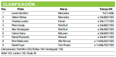 Finalmente, fue victoria para Hamilton y Mercedes, en otro 1-2 en la temporada para la escudería alemana. Con estos resultados, Hamilton aumentó su ventaja en el campeonato, con 223 puntos, seguido por Bottas con 184; Verstappen, 136; Vettel, 123, y Leclerc, 120.