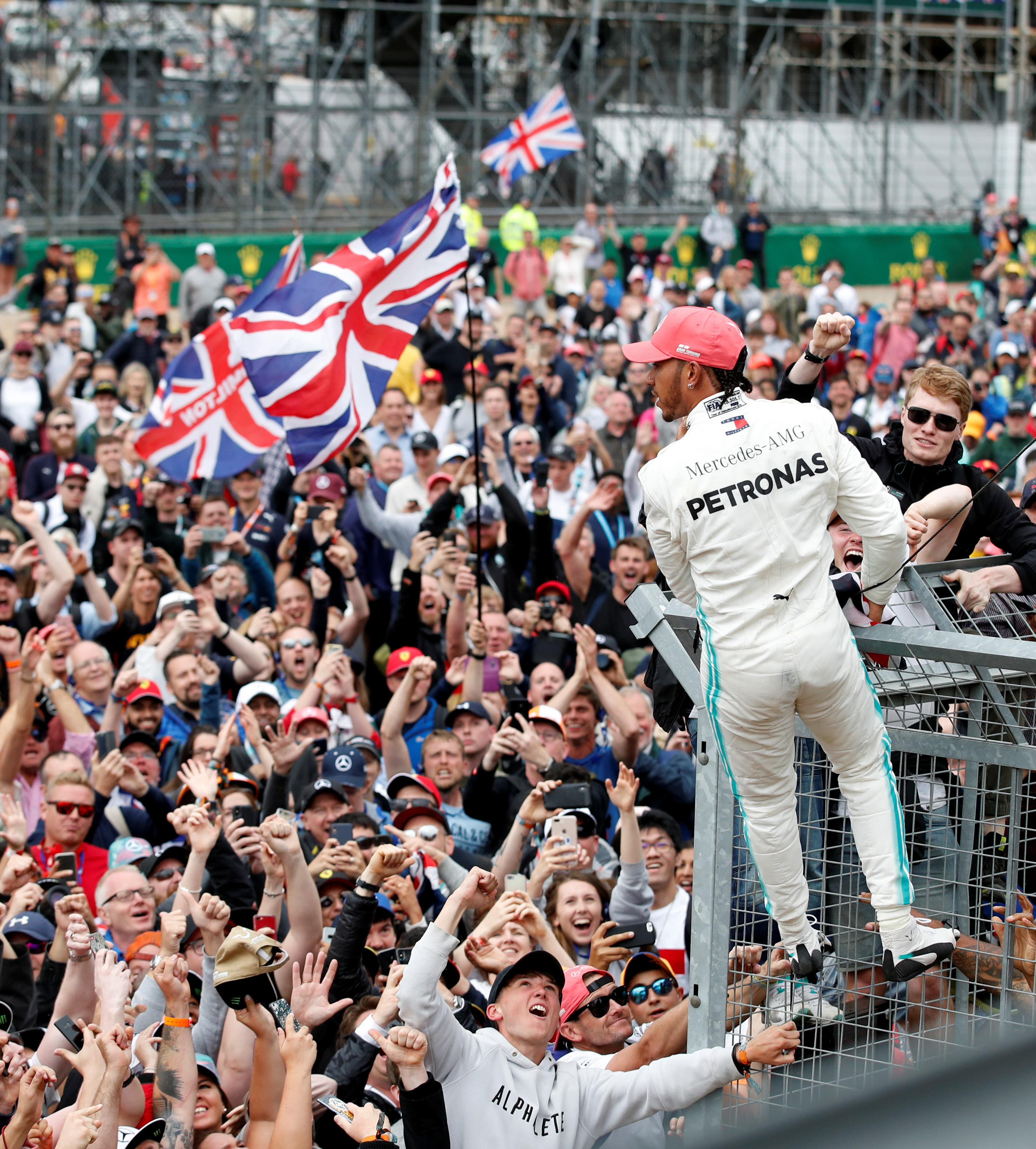 Descontrol. Lewis Hamilton celebró junto a una multitud su victoria en el Gran Premio Británico. Tan eufórico se lo notó que incluso se lanzó en el público en general.