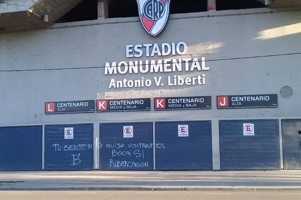 "Tu gente no quiso visitantes, Boca sí. Ribercagon", escribieron en uno de los portones de acceso a la tribuna Centenario de la cancha de River, acompañando las pintadas con una letra "B" recordando el paso de la institución por la segunda categoría en el 2011.