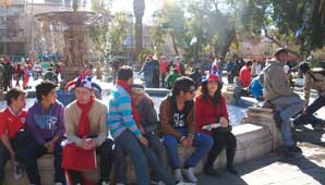 Al mediodía de hoy, sonaban en la plaza 25 de Mayo las canciones de aliento chilenas y flameaban las banderas del vecino país hasta en el campanil de la Iglesia Catedral. En la puerta de la Liga Sanjuanina de fútbol la situación fue similar. Allí, vendedores ambulantes se instalaron con sus banderitas y gorros de Chile y hasta vendían empanadas chilenas.