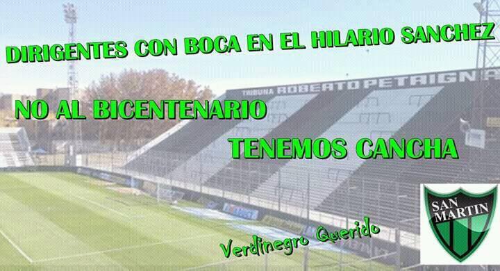Lo cierto es que los simpatizantes de San Martín se metieron en la polémica y mostraron su postura. A través de las redes sociales, manifestaron que se oponen a que el partido se dispute en el escenario pocitano. "No al Bicentenario, tenemos cancha", es el pedido que cada vez va sumando más adeptos. No se descarta que en los próximos días los hinchas lleven a cabo un banderazo.