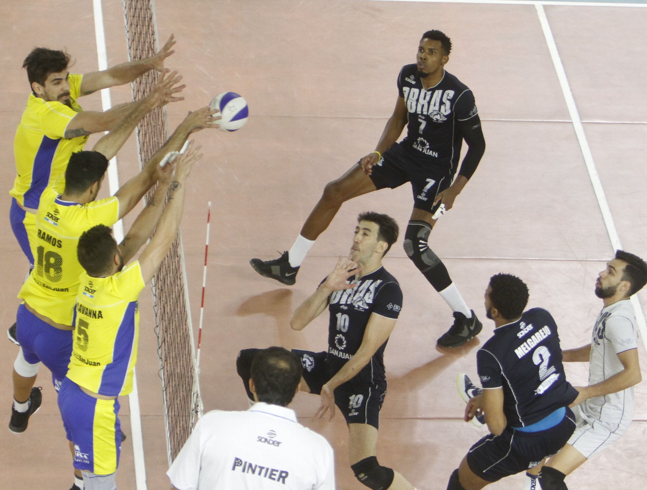 Bloqueo. Melgarejo ya sacó el ataque, que pegó en el triple bloqueo de Hage, Ramos y Cavanna. Esa fue un arma importante de UPCN.