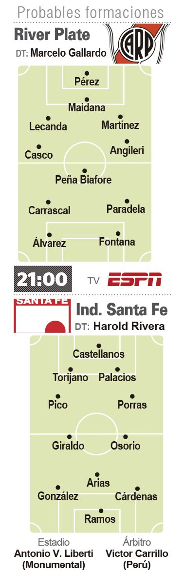 El equipo de Núñez tendrá en el arco a Enzo Pérez, emblema y volante durante la gestión del Muñeco y quien ante Boca el domingo pasado apenas disputó el primer tiempo ya que salió por una molestia física. En la práctica de ayer, y tras la Conmebol descartar el pedido del club de incluir al arquero Leo Díaz de manera "excepcional", el técnico se inclinó por el mendocino para estar hoy desde el inicio bajo los tres caños. Con la particularidad que podrá ir rotando el cuidapalos del equipo durante el encuentro ya que no se trata de un cambio "tradicional".