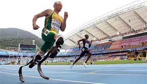 Pistorius usa piernas artificiales de fibra de carbono y fue aceptado para correr con las mismas a partir de 2008, cuando el Tribunal Arbitral del Deporte (CAS) desechó un amparo de la Federación Internacional de Atletismo (IAAF) , señalando que esas piernas artificiales le daban una ventaja injusta.