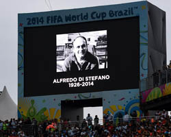 El fallecido ex delantero hispanoargentino del Real Madrid Alfredo Di Stéfano recibió un homenaje poco antes de que Argentina disputara la semifinal del Mundial contra Holanda.