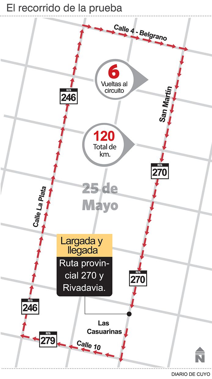 Anoche, hasta luego del cierre de esta edición, la entidad organizadora, estaba recibiendo las inscripciones para la carrera, que se largará y culminará en el distrito Las Casuarinas; pero que "tocará" los distintos puntos cardinales que albergan la parte más urbana de 25 de Mayo, como es su villa cabecera, Santa Rosa, y otros barrios tradicionales. Serán 120 kilómetros, de trazado llano, que suelen recorrerse a veloz ritmo de competencia.