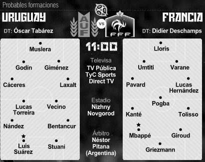 Rusia 2018 es historia pasada y amarga para los argentinos pero el Mundial sigue y hoy saldrán los dos primeros semifinalistas. Serán dos cruces apasionantes con cuatro aspirantes que tienen su estilo. Uruguay y Francia marcarán el arranque de los cuartos de final en un duelo marcado por el buen estado de forma de Kylian Mbappé, que pondrá a prueba al sistema defensivo de Uruguay, el mejor del Mundial, y a la posible ausencia de Edinson Cavani, el referente charrúa en ataque. Argentina, con un sistema caótico, fue una pista de atletismo para Mbappé, que casi él solo acabó con el combinado de Jorge Sampaoli en octavos de final. Primero, en una carrera monumental de velocista con la que provocó el penal que abrió el partido. Después, con dos goles que enterraron al cuadro albiceleste. Pero en cuartos Mbappé quiere más. Está en el camino hacia la gloria y parece que nadie puede frenarle. Nadie excepto Uruguay, que sólo ha recibido un gol en cuatro partidos y presentará un sistema que no beneficiará en nada a la velocidad del jugador del París Saint-Germain. Un verdadero duelo de estilos cara a cara y por un lugar en las semifinales.