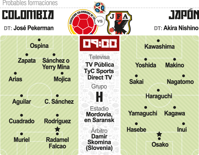 Por antecedentes y actualidad, Colombia parte como favorita para llevarse la victoria ante los nipones, dentro de un grupo que comparten con Polonia y Senegal, pero no quiere ser otra de las víctimas de la Copa del Mundo, luego de los empates de Argentina ante Islandia y de Brasil con Suiza, ambos 1-1, y la derrota del defensor del título, Alemania, 1-0 ante México.