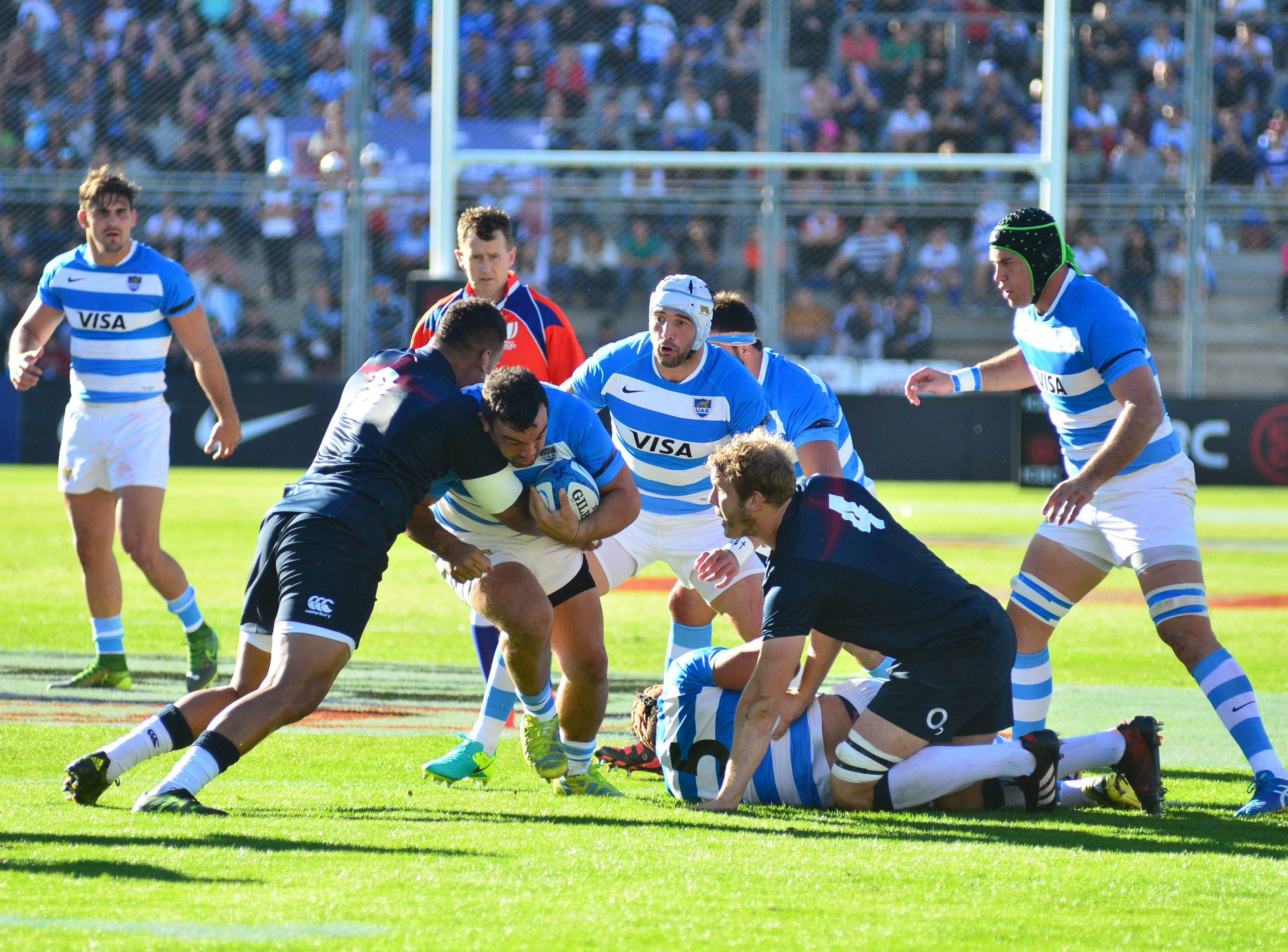 Empuja. El hooker argentino, Agustín Creevy, arremete con toda su potencia ante la marca del octavo de Inglaterra, Nathan Hughes. Los Pumas tuvieron una gran chance de superar al número dos del ranking IRB, aunque la desperdició.