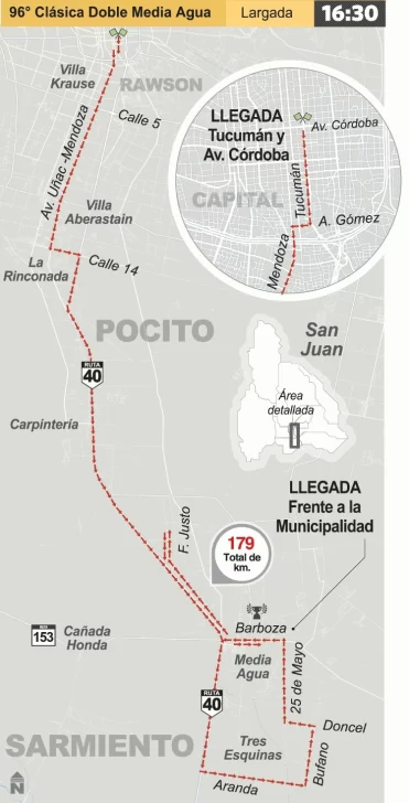 En esta ocasión partirá desde San Juan, en la tradicional esquina de Córdoba y Tucumán, frente al local comercial de Moto Lucero, como homenaje a Miguel Lucero (fallecido) que fuera presidente del club, pero no retornará a la Capital, porque está previsto que se desarrollen los dos tercios finales (tendrá 179 kilómetros) dando dos vueltas a un circuito que llevará al pelotón -al norte. por Tres Esquinas, bordeará al casco urbano y pondrá proa al sur, para pasar por Cochagual, Punta del Médano y la Colonia Fiscal (en dos ocasiones) para luego ingresar a la villa de Media Agua, donde concluirá.