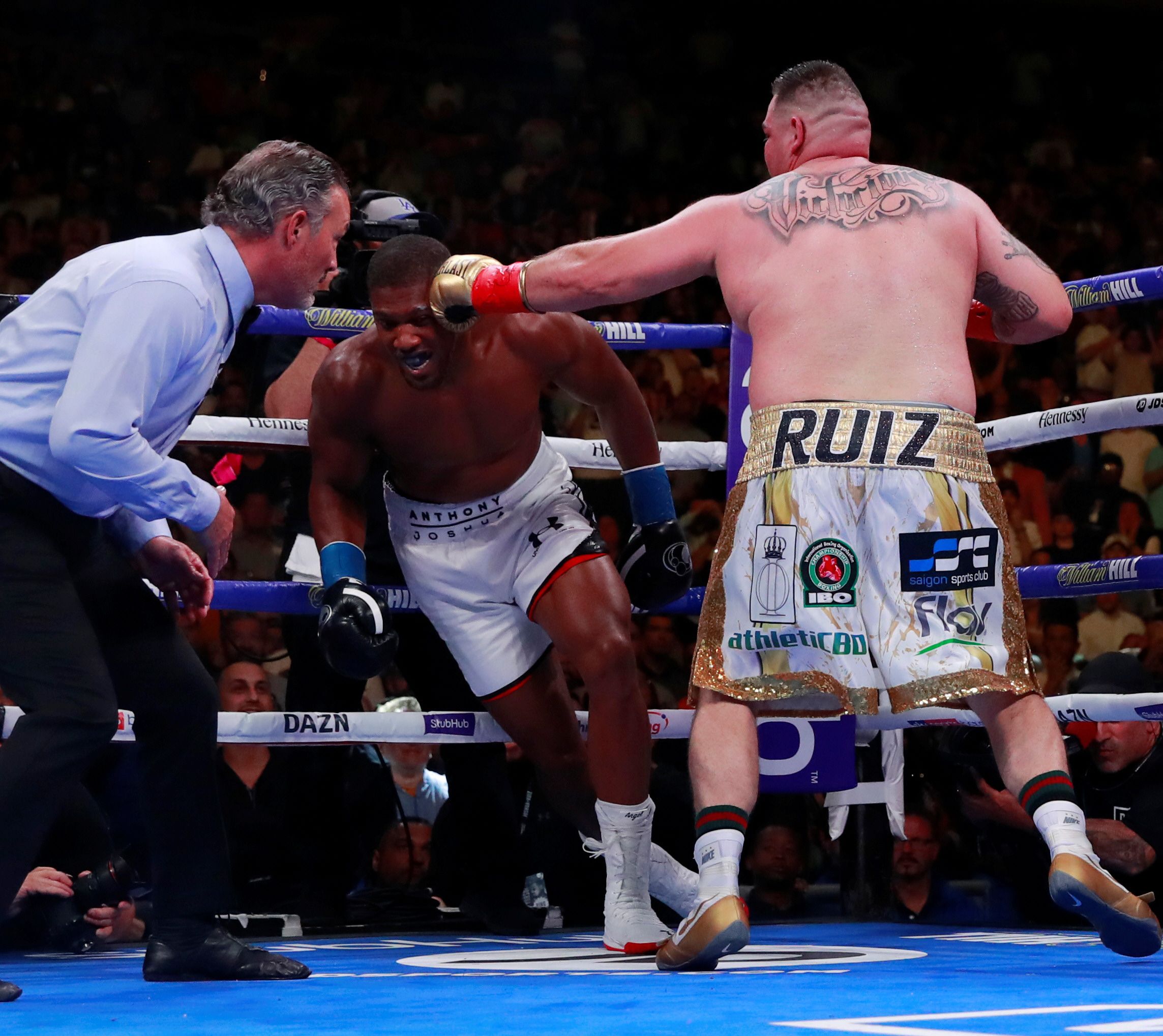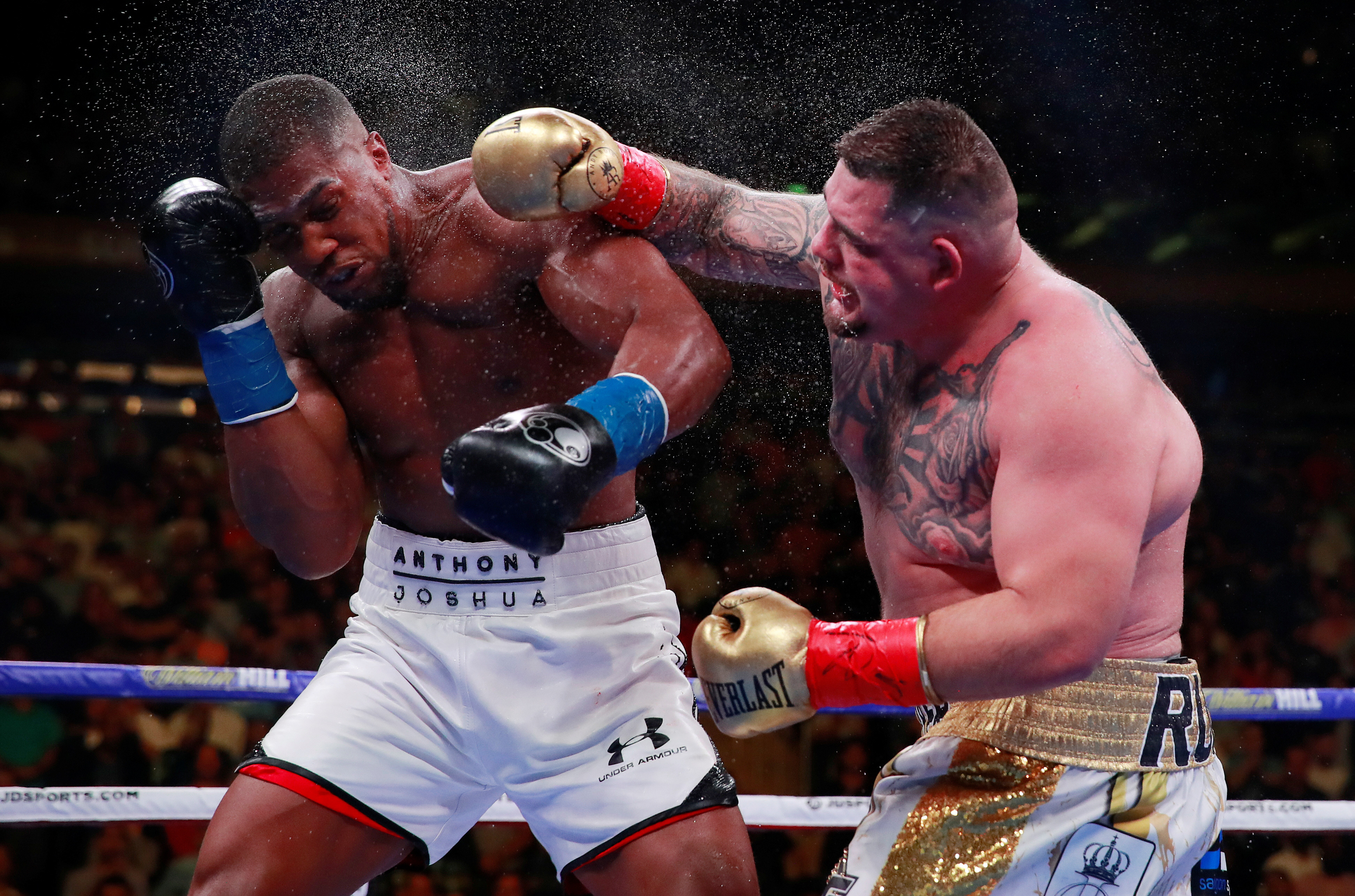 Ruiz Jr. había caído primero en el tercer round luego de una dura mano del británico que hacía su debut absoluto en los rings de Estados Unidos. Sin embargo, rápidamente logró reponerse el mexicano: le puso dramatismo y una cuota de incertidumbre a la velada al tirar en dos ocasiones a su rival. Joshua quedó sentido. Lo salvó la campana en ese momento. No volvió a ser el mismo a lo largo de toda la pelea. Era un combate sencillo en los papeles que de golpe se había transformado en su noche negra.