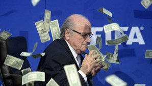 La imagen del día: un tipo le tira billetes a Blatter antes de la conferencia de prensa: pic.twitter.com/FHOyUalK8R”