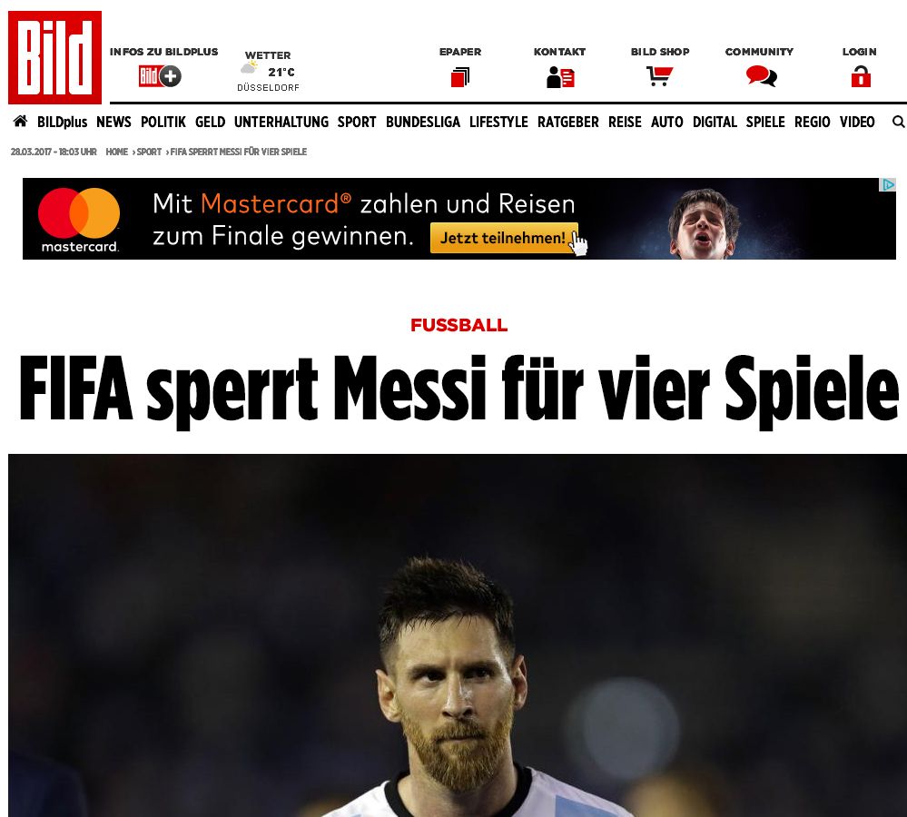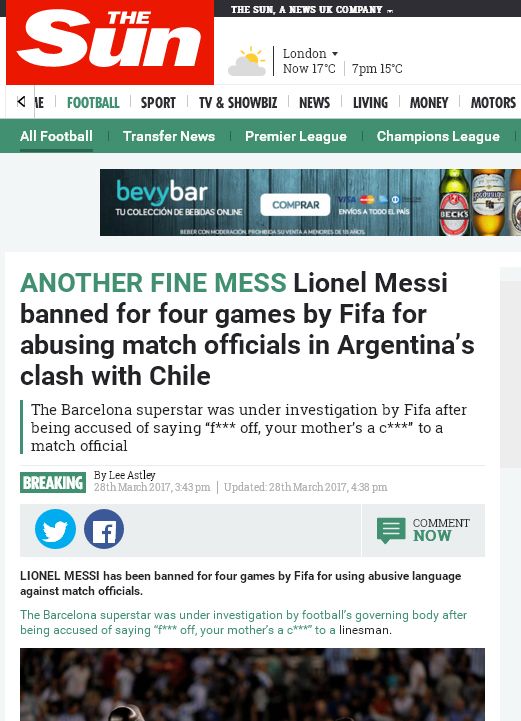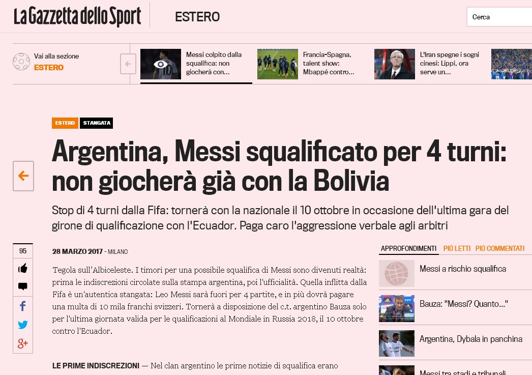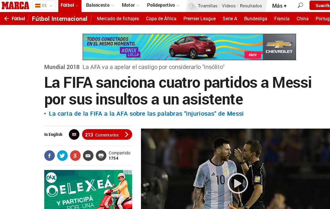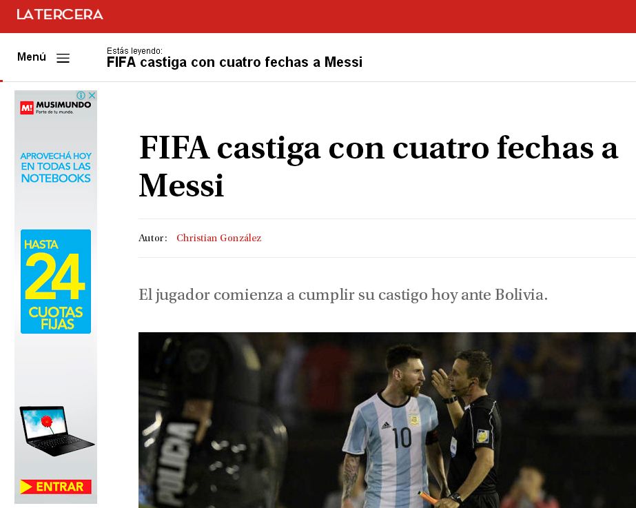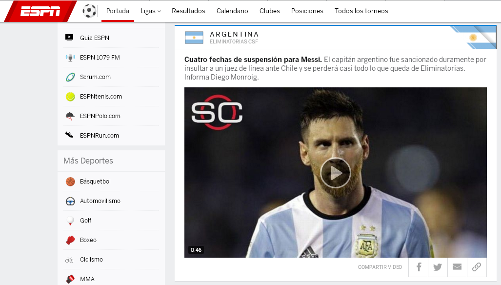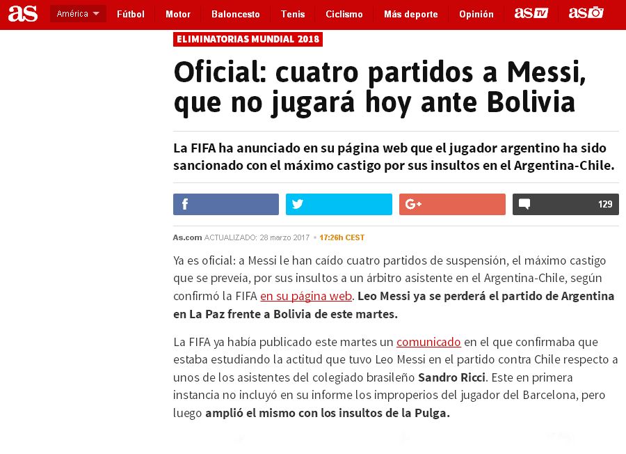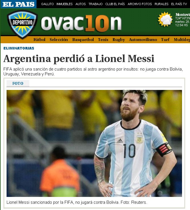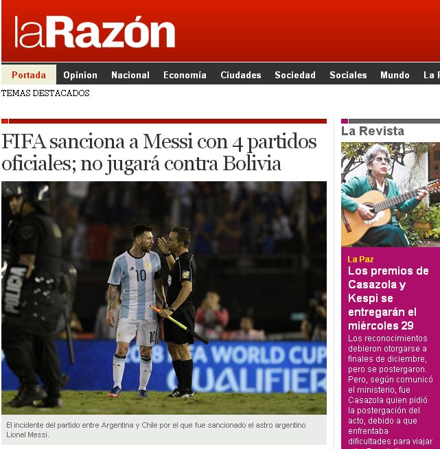 Portales digitales de distintas partes del mundo se hicieron eco de la dura sanción aplicada por la FIFA al crack de la Selección, luego de sus insultos al juez de línea frente a Chile.