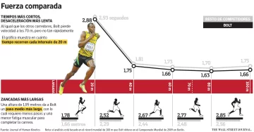Aun así, la noción de que la fatiga muscular comienza instantáneamente y con cada contracción muscular puede explicar por qué Bolt es tan difícil de superar. El jamaiquino es considerablemente más alto que sus competidores, y su capacidad para dar pasos rápidos —denominada frecuencia de zancada— es tan buena como la de cualquier rival. No obstante, Bolt puede cubrir más terreno con menos pasos, lo que le permite completar 100 metros con sólo 41 zancadas, mientras que sus oponentes promedian alrededor de 45.