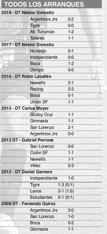 Son siete los comienzos de año que reúne San Martín en Primera División (ver tabla aparte), y nunca antes había obtenido apenas 2 puntos de 12 en juego como en los dos mencionados. Incluso en el 2017 se extendió la anemia de victorias y recién obtuvo el primer triunfo en el 7mo partido al superar 2-1 a Belgrano. Esos fueron los primeros partidos de Gorosito, a diferencia de los actuales con todo un año acumulado de trabajo y un rendimiento futbolístico más rico y ya con una identidad de juego.
