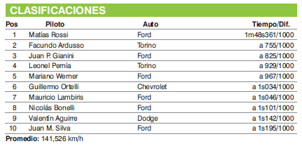 Detrás de Rossi se ubicó Facundo Ardusso (Torino), quien de esta manera se reinvidicó por la quita de tiempos el viernes y avisó que está para dar pelea. En tanto que en la tercera posición se ubicó Juan Pablo Gianini (Ford), otro de los aspirantes a ganar y quien de hecho necesita una victoria para cumplir con ese requisito en su búsqueda del título.