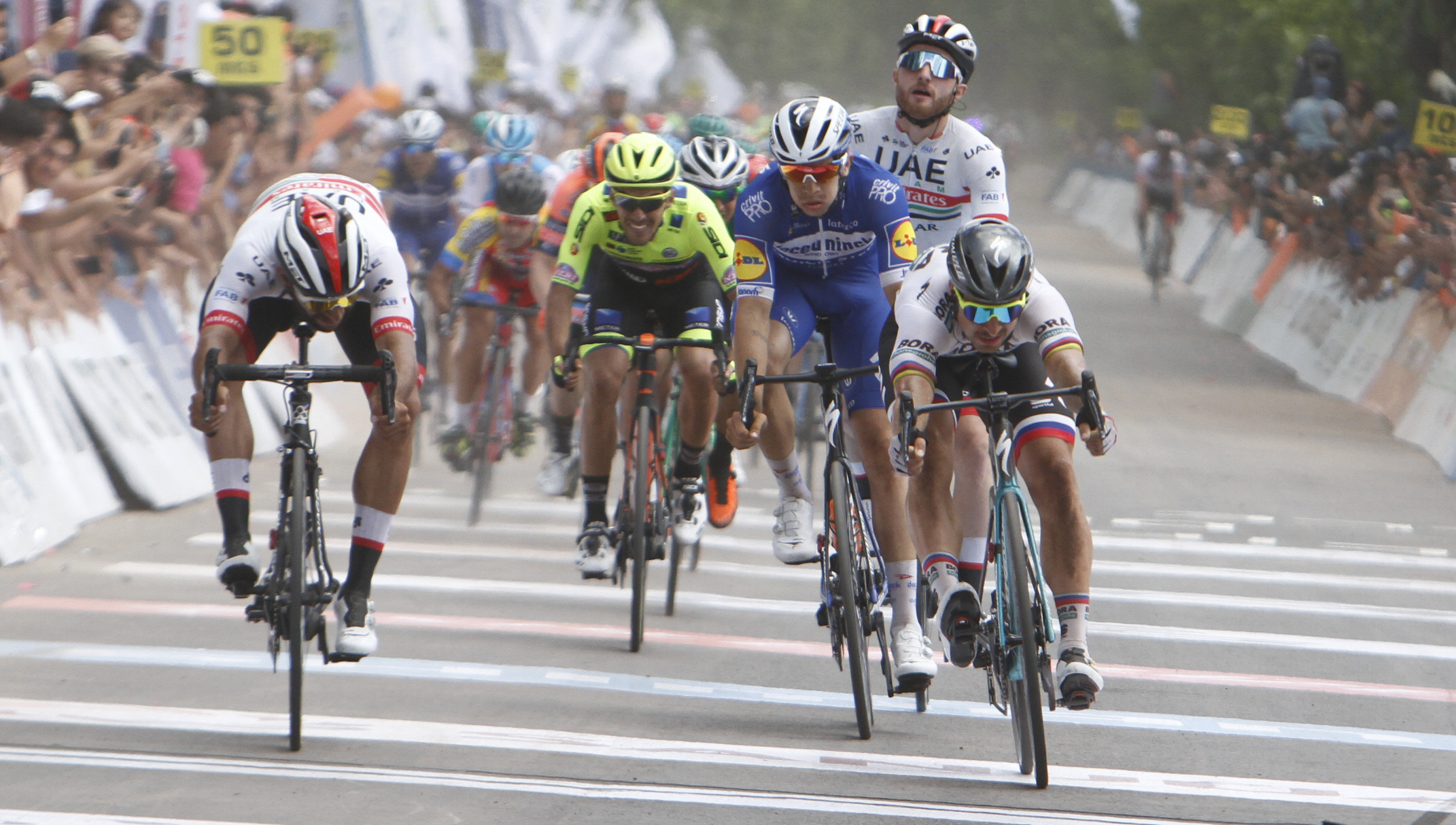 Los trenes de cada equipo venían formados por calle Tucumán y al girar por General Acha fue el conjunto del líder el mejor armado. Evenepoel levantó el ritmo, luego fue Alaphilippe quien se puso de cabeza y lanzó a Maximiliano Richeze quien traía pegado a su rueda a Álvaro Hodeg. El "atómico" hizo su trabajo y se abrió para que el joven colombiano rematara la faena, pero por su derecha ya venía acelerando Gaviria a quien lanzó Consonni. Peter Sagan trató de sorprender por adentro pero su esfuerzo fue estéril, el cohete colombiano había encendido todos sus motores y lo dejó sin chance.