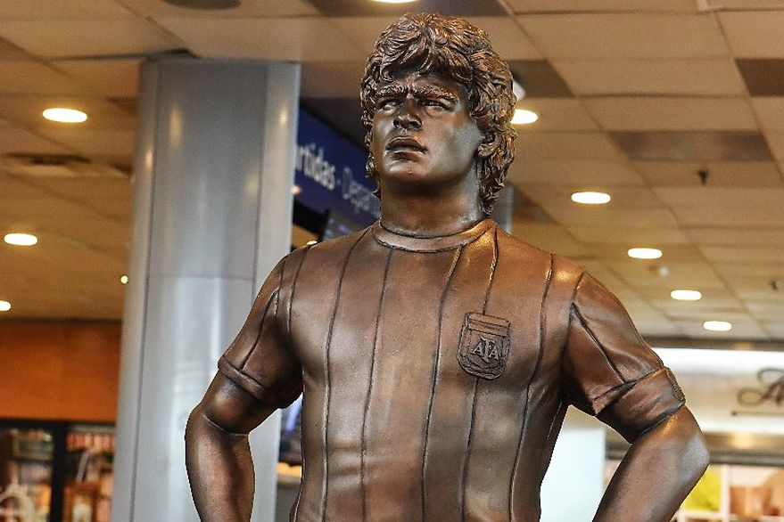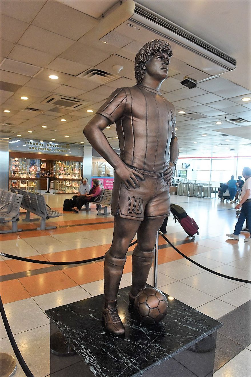 Aeropuertos Argentina 2000 inauguró hoy la estatua de Diego Maradona en el aeropuerto Internacional de Ezeiza. La estatua quedará emplazada en el primero piso de la terminal A de Ezeiza, y respeta la altura real del excapitán de la selección. Desde este miércoles, los pasajeros y visitantes del aeropuerto pueden visitarla. La escultura fue elaborada bajo la técnica de impresión 3D a partir de tereftalato de polietileno (más conocido como PET).