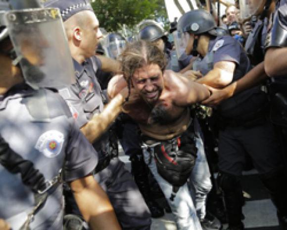 Cerca de 150 hombres de la Tropa de Choque de la Policía Militarizada del estado de Sao Paulo dispersaron a un grupo de 50 manifestantes que intentaba marchar por la avenida Radial Este, la principal vía de acceso al Arena Corinthians, el estadio de Sao Paulo en que se disputará el partido inaugural del Mundial.