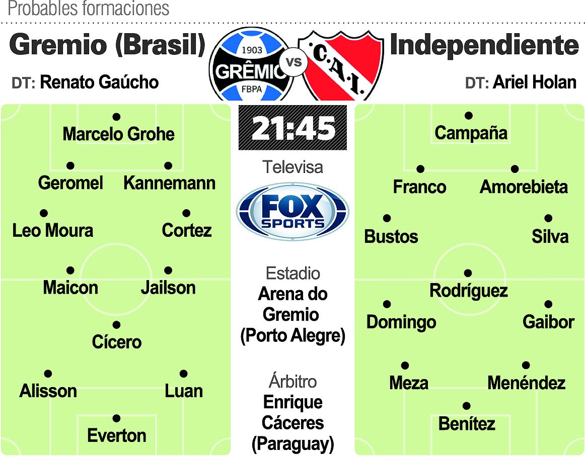 Gremio también tiene en sus vitrinas una Recopa Sudamericana, la de 1996, en cuya final venció justamente a Independiente, que perdió también la final en 2011 ante Internacional, el otro protagonista del clásico de Porto Alegre. Para el encuentro de hoy, el entrenador, Ariel Holan, deberá realizar una variante obligada por la roja que vio Emmanuel Gigliotti en la ida y su reemplazo saldrá entre Silvio Romero o Leandro Fernández, ambos delanteros,o el volante central uruguayo Diego Rodríguez, quien se perdió el juego de ida por cumplir una fecha de suspensión por tarjetas amarillas acumuladas de la sudamericana. En caso de ingresar alguno de los delanteros, el esquema sería exactamente igual al de la ida más allá de las características puntuales de cada jugador, pero de entrar el “Torito” este haría dupla en el medio con Nicolás Domingo.