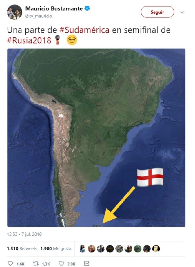 "Una parte de Sudamérica en semifinal del Mundial de Rusia", escribió Bustamante acompañando el texto con una foto del mapa de Sudamérica y una flecha señalando las Islas Malvinas acompañada por la bandera de Inglaterra. ¿La excusa? El arribo del equipo inglés a las semifinales de la Copa del Mundo.