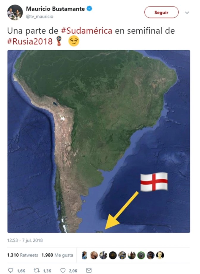 "Una parte de Sudamérica en semifinal del Mundial de Rusia", escribió Bustamante acompañando el texto con una foto del mapa de Sudamérica y una flecha señalando las Islas Malvinas acompañada por la bandera de Inglaterra. ¿La excusa? El arribo del equipo inglés a las semifinales de la Copa del Mundo.