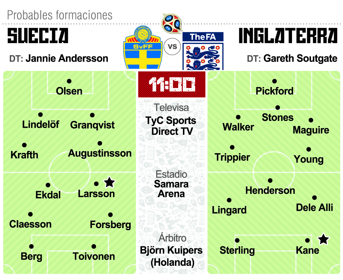 Desde las 11, Inglaterra buscará seguir con vida en este Mundial donde junto a Francia son los únicos seleccionados que alguna vez fueron campeones. Tendrá sin dudas el rótulo de "candidato" en el cruce por cuartos de final ante Suecia, en la ciudad de Samara. Los dirigidos por Garet Southgate vienen de eliminar a Colombia, en un choque que debió llegar hasta la definición por penales y en ese sentido puede brindarle una ventaja a los suecos. Justamente los auriazules, en el choque de octavos de final, debieron superar por 1-0 a Suiza, sin antes haber sufrido bastante, pero sabiendo que en la gran defensa que tienen está el mayor argumento para continuar soñando. Será el tercer cruce en Mundiales entre ambos, habiendo empatado el par anterior.