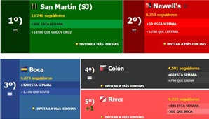 San Juan, 11 de abril.- Ni Boca, ni River. Tampoco Independiente o San Lorenzo. ¡San Martín es quien aparece encabezando un ranking nacional de hinchas! Con 15.740 votos, el Verdinegro se encuentra primero, con mucha diferencia con respecto al segundo, Newells. La Lepra tiene 8.353. Boca figura tercero con 4.874 seguidores.