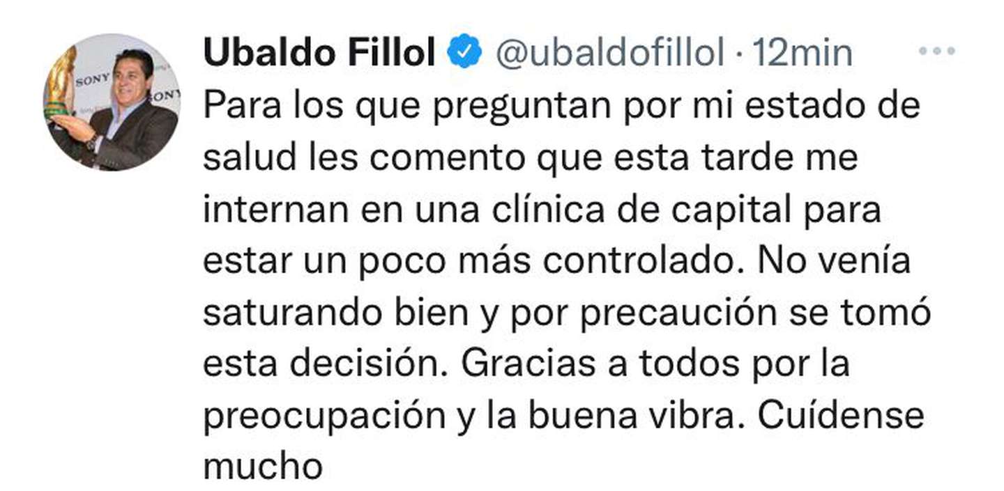 El propio exjugador comunicó -en su cuenta de twitter- el traslado a un centro médico: “Para los que preguntan por mi estado de salud les comento que esta tarde me internan en una clínica de Capital para estar un poco más controlado. No venía saturando bien y por precaución se tomó esta decisión. Gracias a todos por la preocupación y la buena vibra. Cuídense mucho”.