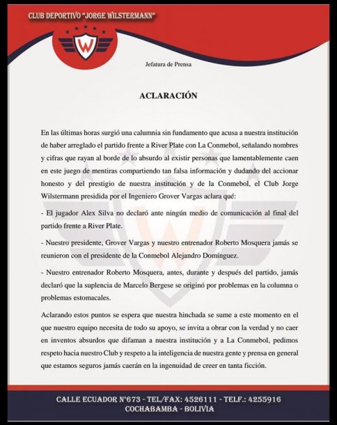 Frente a dichos argumentos, Wilstermann señala en su comunicado que “Alex Silva no declaró ante ningún medio de comunicación al final del partido”; que el presidente del club, Grover Vargas, y el entrenador, Roberto Mosquera, “jamás se reunieron con el presidente de la Conmebol, Alejandro Domínguez”, y que Mosquera “jamás declaró que la suplencia de Marcelo Bergese se originó por problemas en la columna o problemas estomacales”.