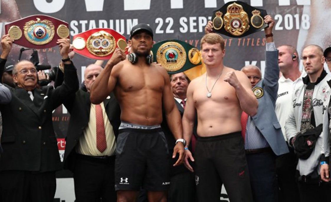 El Campeón Mundial Pesado de la Federación Internacional de Boxeo (FIB) y de la Organización Mundial de Boxeo (OMB), y Supercampeón de la Asociación Mundial de Boxeo (AMB), el inglés Anthony Joshua (21-0-0, 20 KO), expondrá hoy sus coronas unificadas, ante el peligroso excampeón mundial ruso, Alexander Povetkin (34-1-0, 24 KO), en la pelea estelar de una súper cartelera que se llevará a cabo en el Estadio Wembley, de Londres, Inglaterra. La pelea será televisada, desde las 16.30 por Space.